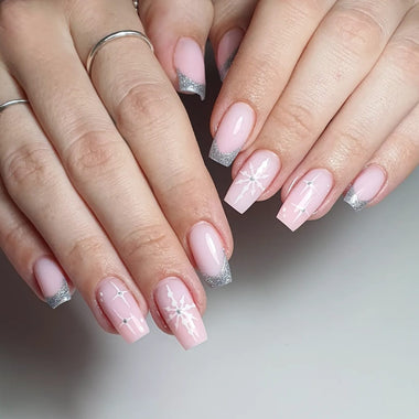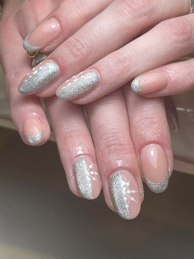 Silver French tip and snowflake nail design using the Halo gel polish shade 'Glass Slipper'