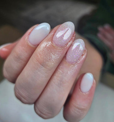 A translucent white base with iridescent shimmer - perfect for bridal and festive nails.