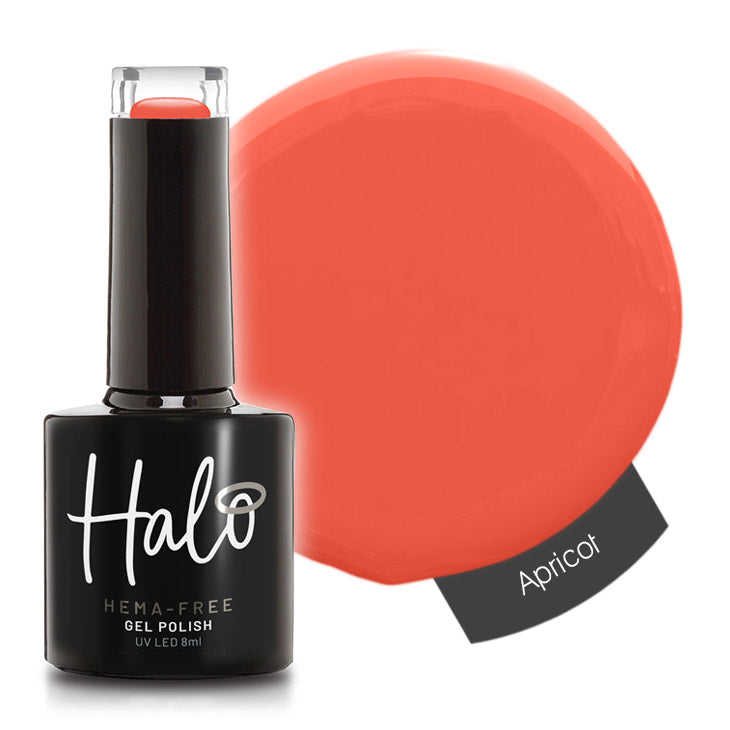 1. Halo gel polish bottle with apricot color swatch on a white background