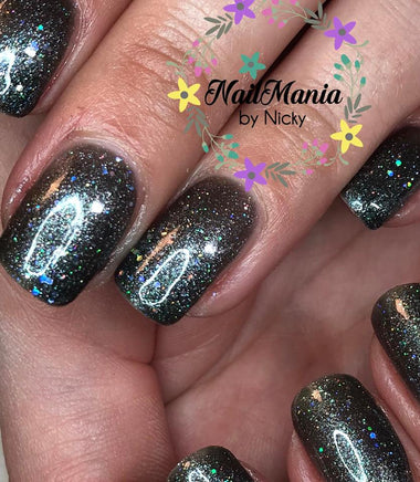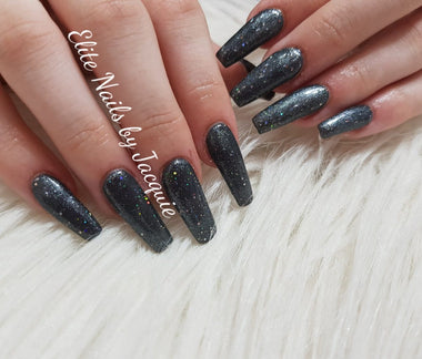 Mysterious, glamorous, and bold, this dark glitter polish is perfect for party season or clients who love a moody, edgy vibe.