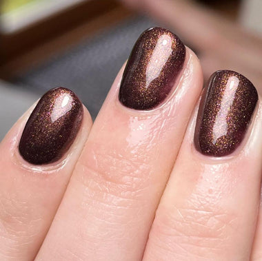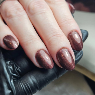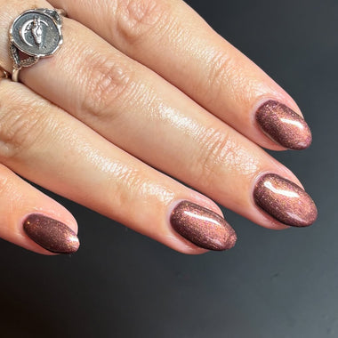 Honesty is a deep, rich chocolate brown infused with a subtle warm bronze shimmer. This sophisticated shade catches the light with a gentle metallic glow, perfect for clients seeking an elegant, refined manicure.