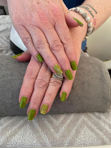Khaki green glitter nail look using the Halo Gel Polish shade 'Jungle'