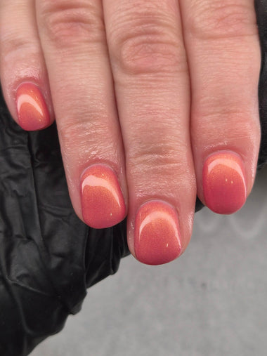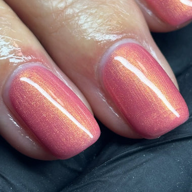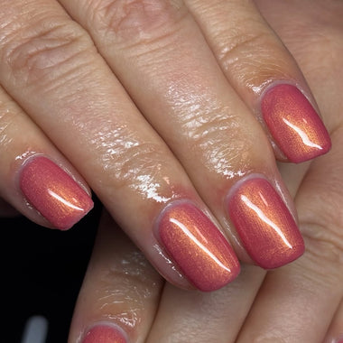 A warm, salmon-coloured hue with golden shimmer that creates a glowing, radiant effect, giving your nails a sophisticated and warm finish.